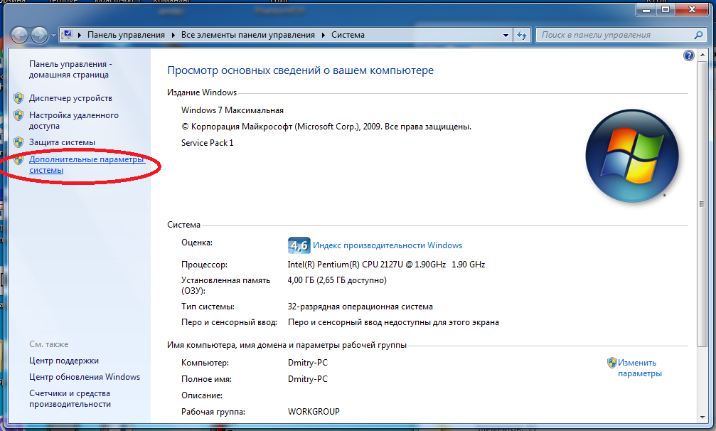 Заходим в свойства компьютера, выбраем вкладку «Дополнительные параметры»