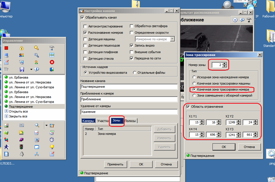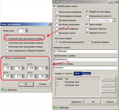 Заходим в канал основной распознающей камеры, и в закладке «Зоны» добавляем исходную зону нахождения номера. Выехав из этой зоны и попав в зону подтверждающей камеры, номеру а/м будет присвоено нарушение