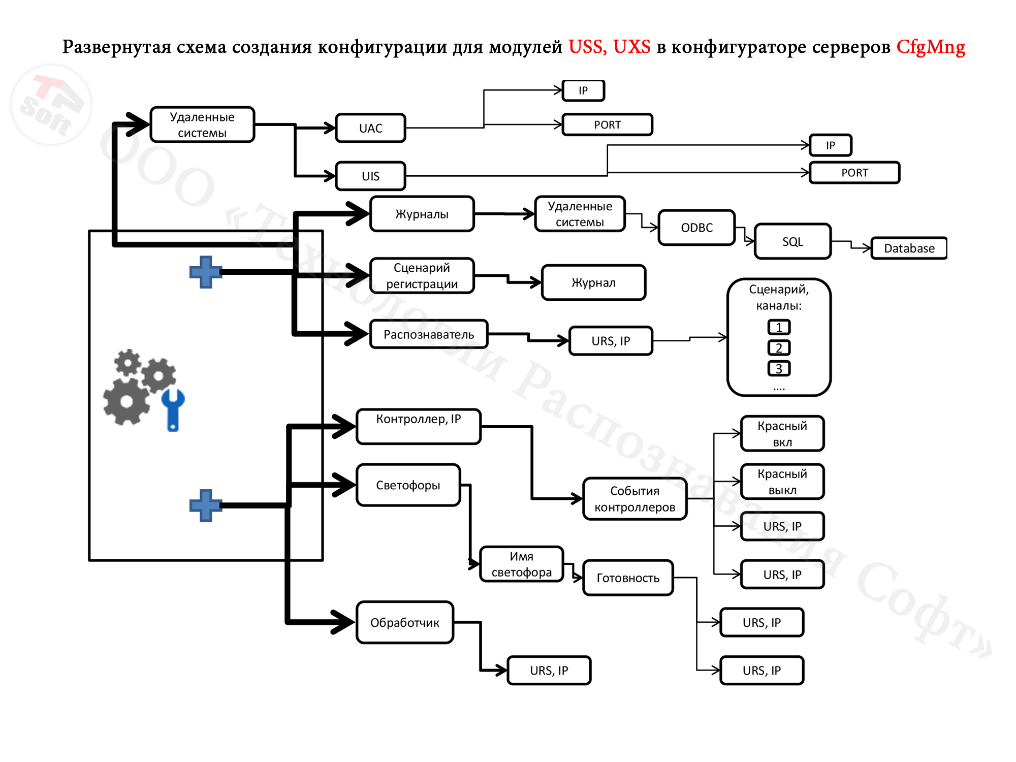 Развернутая схема создания конфигурации для модулей USS (Сервера хранения), UXS (Сервера внешних устройств) в конфигураторе серверов CfgMng