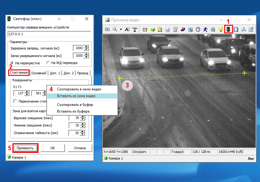 4.На вкладке «Стоп-линия», область «Координаты»,щелчком левой кнопки мыши вызвать диалог, выбрать пункт «Вставить из окна видео». В окне «Просмотр видео» цвет нарисованной стоп-линии изменится на зеленый.