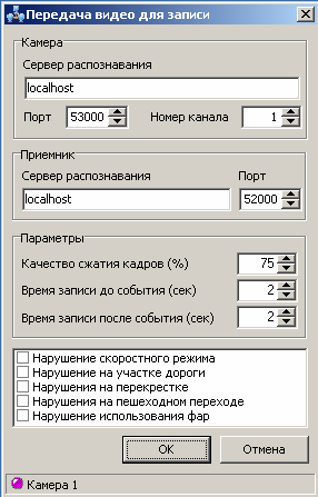 Параметры: качество сжатия, время предзаписи и постзаписи. Чекбоксы с типами нарушений, по которым будет отправляться запись.