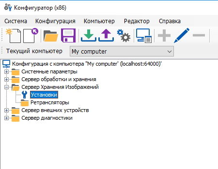 Заходим в конфигуратор нашего сервера через ярлык CfgMng.exe. Нас интересует раздел «Сервер Хранения Изображений».