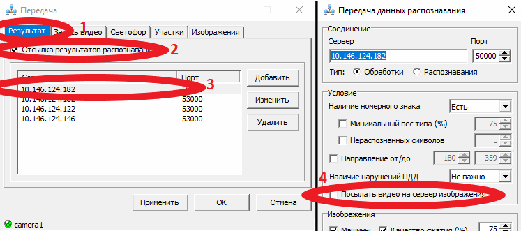 Выбираем вкладку Результат → Чекбокс «Отсылка результатов распознавания» должен быть выставлен, если проводились предварительные настройки серверов → Выбираем в поле добавленный сервер → Заходим в его настройки и ставим чекбокс «Посылать видео на сервер изображения».
