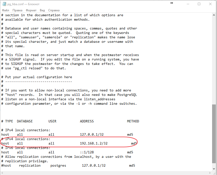 Сохраняем файл. Далее необходимо перезапустить Postgres.