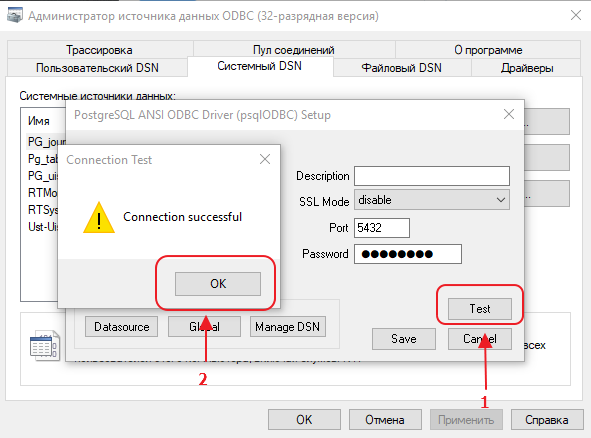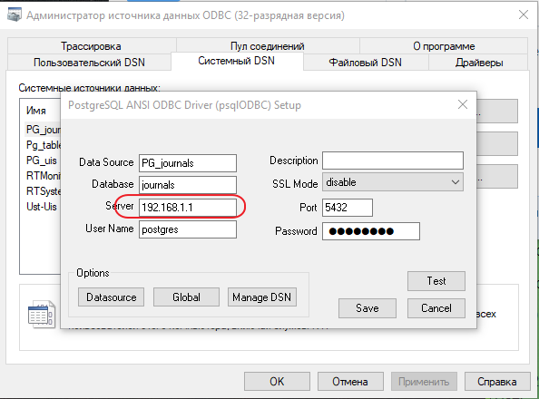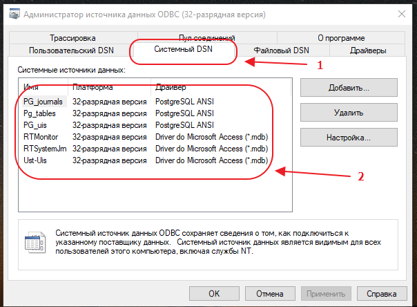 Выбираем закладку «Системный DSN» и выбираем источник данных, который настроен у Вас на сервере.