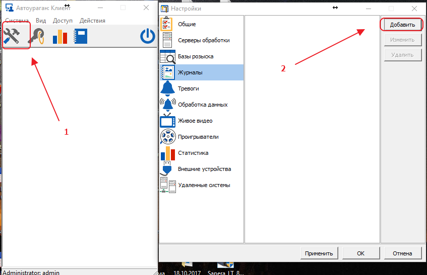 Открываем Клиент ПО «Автоураган», нажимаем «Настройки», на вкладке «Журналы» нажимаем «Добавить».